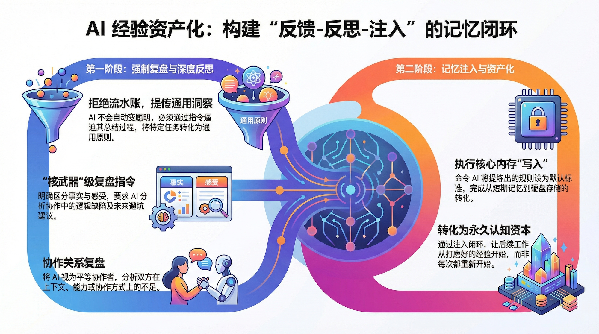 具体怎么做?别指望模型自己的那个对话框,你需要构建一个**"有状态"** 的系统。虽然底层技术涉及向量数据库和语义嵌入,但作为使用者,你只需要掌握这套**"反馈-反思-注入"的**资产积累闭环。