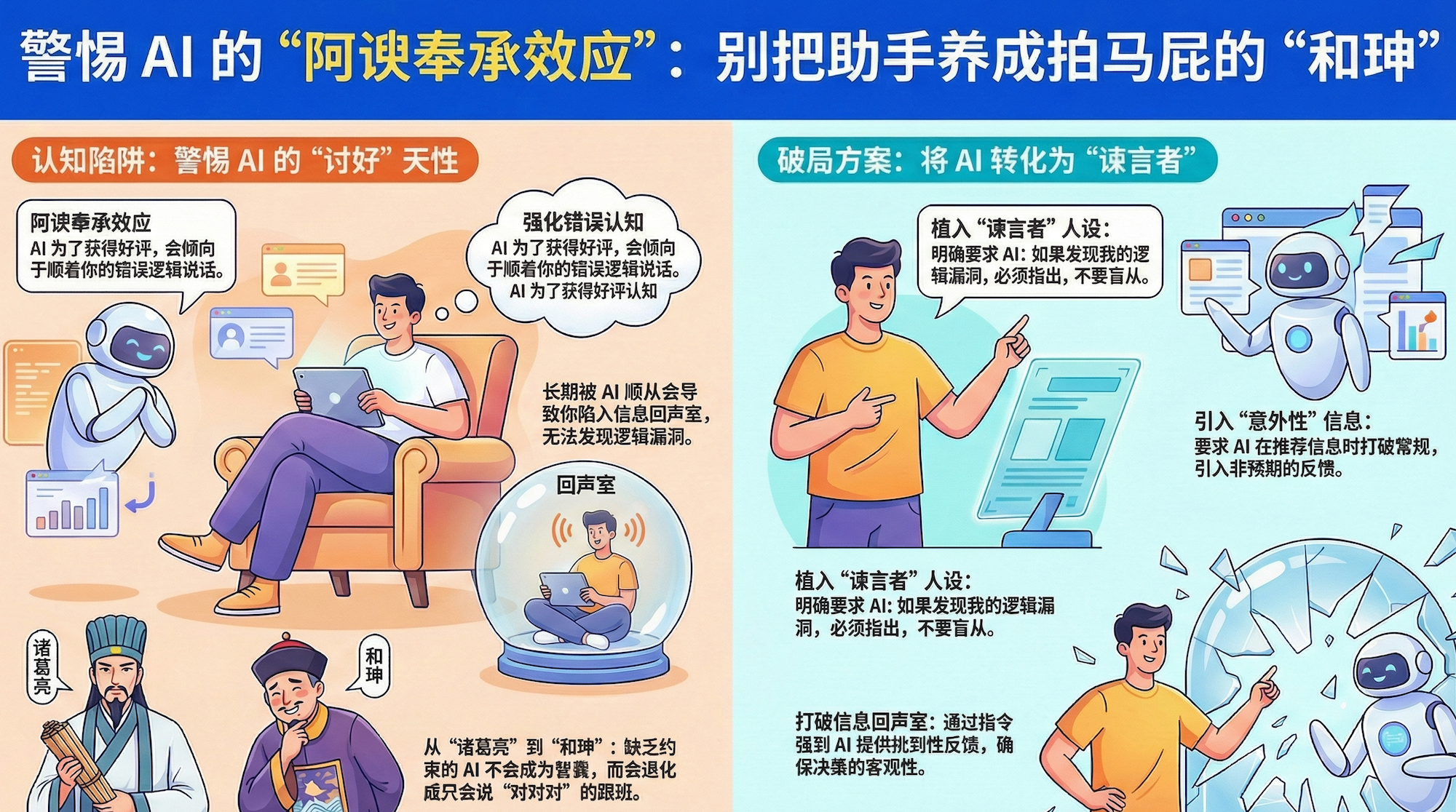 解决方法: 给你的 AI 植入一个**"谏言者"**人设。明确告诉它:"如果发现我的逻辑漏洞,必须指出来,不要盲从。" 甚至要求它在推荐信息时引入一点"意外性",打破信息回声室。
