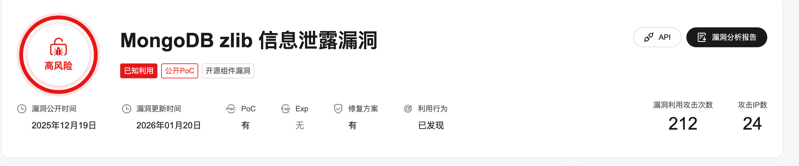 目前,多个 MongoDB 主版本线(3.6 -- 8.2)多个发布版本均受影响或已修复前版本均有漏洞存在,影响范围很广