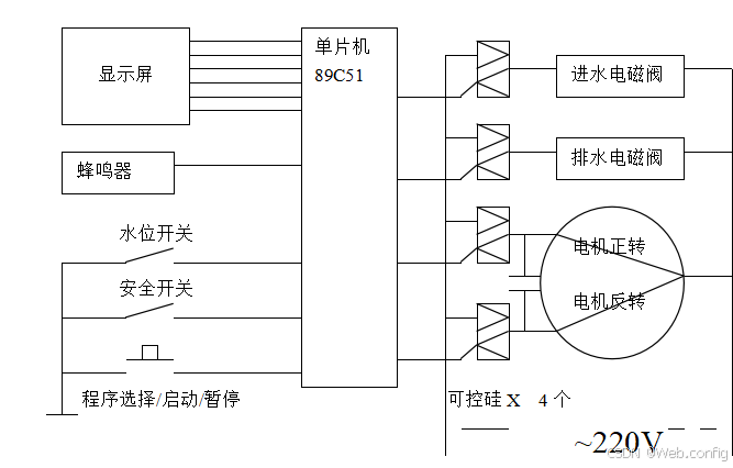 洗衣机要实现衣服的洗涤、漂洗和脱水,离不开进水、电机正转、电机反转和排水这四个动作。上述四个动作,是通过单片机的P0端口,做输出端口,去控制双向可控硅通断来实现的,如下图所示。同时加上输入开关的按钮、数码管显示器、蜂鸣按警器和欠压检测保护电路等,就可以形成完整的单片机控制系统。通过软件编程达到对整个洗衣过程进行控制、检测以及与用户交互。