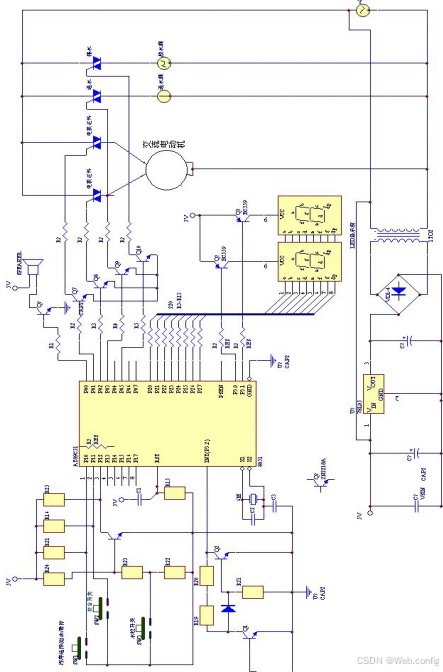 可控硅洗衣机的几个关键动作,如进水、排水、电机正转、电机反转,是通过单片机的IO端口,输出控制信号,控制可控硅的通断来实现的。在这里我们用了4个双向可控硅担任控制系统的执行部件。