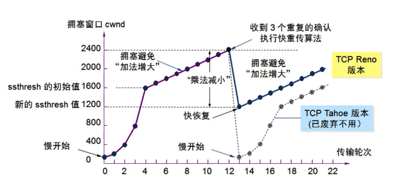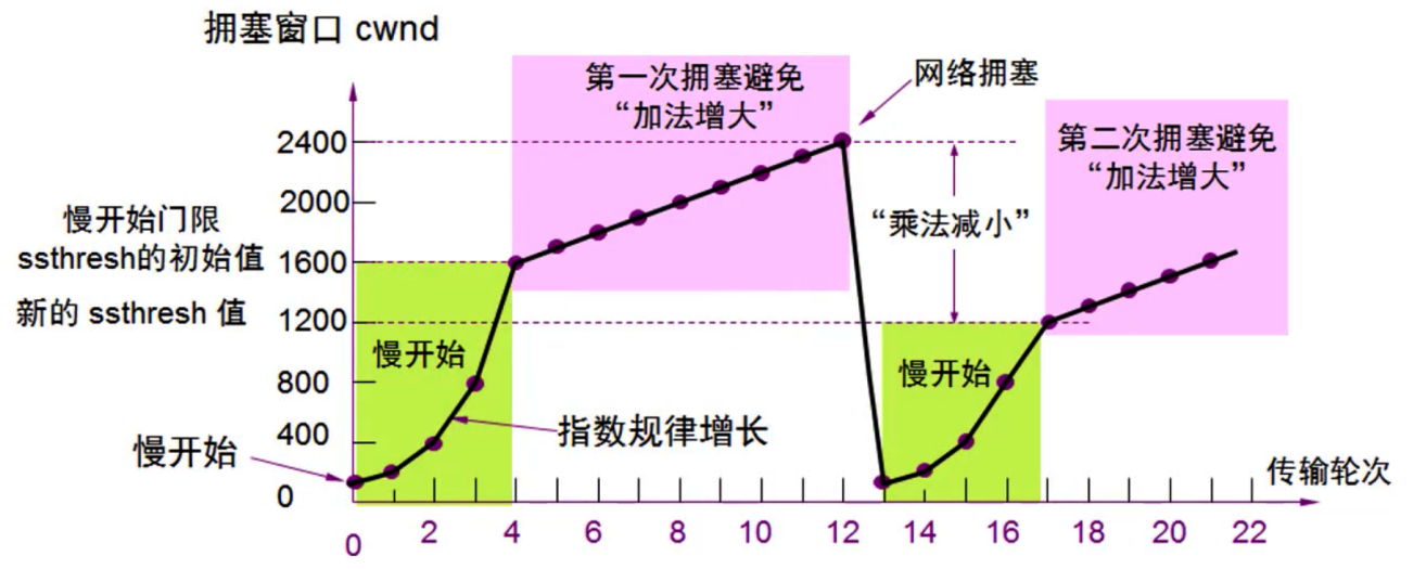 ● 拥塞避免(加法增大):拥塞窗口缓慢增大,以防止网络过早出现拥塞