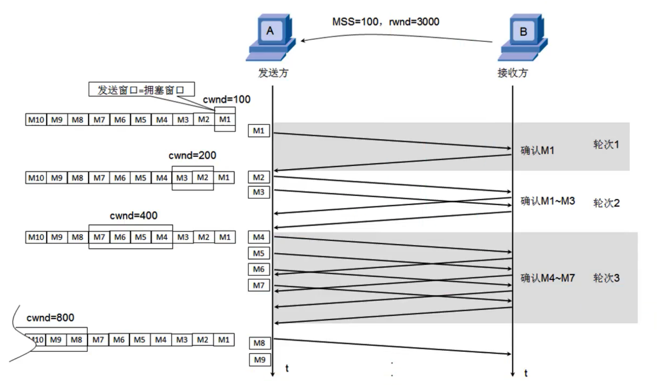 ● cwnd的初始值比较小,然后随着数据包被接收方确认(收到一个ACK)