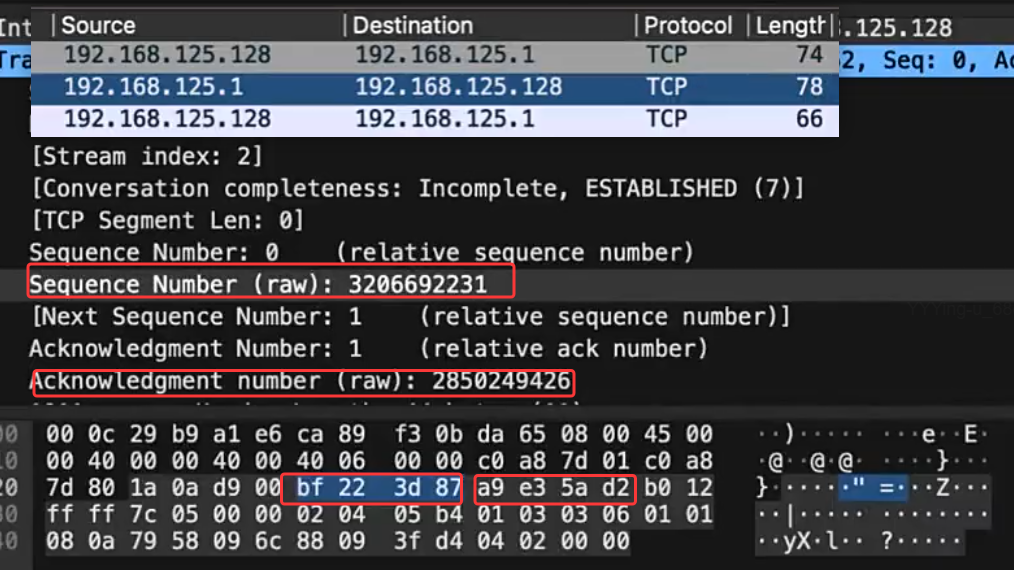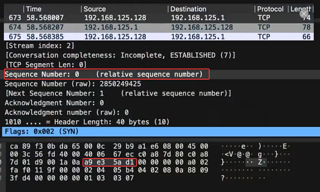我们服务器先有状态后,我们客户端才能向服务器发起连接,这个状态也就是此处右边的LISTEN监听 ,那么我们客户端发来的第一次握手,我们服务器是怎么区分的呢,很简单,我们可以看,此处的SYN=1而ACK=0(图中未标),这就是我们第一次握手的标志,后面的所有数据包ACK都会是1。那我们第一个包的目的就是为了告诉对方自己数据包的起始序号,那有些人会问,那这不是常识吗,有什么必强调的呢?其实这里面还是有点说法的,我们在第一次握手这我们的序号其实是有两个的,其中一个是为了防止别人拿到我这个包后并不知道这是第一个包,如下图这是我们TCP三次握手的第一次握手的包,可以看到虽然我们序号是0,但看下面的16进制数怎么都不像0啊,所以在此处我们的0只是相对序号罢了,而在真实网络上传输的数据就是我们下一行,而这个0你也只能在抓包软件看到了,当然对方也能自动识别出。