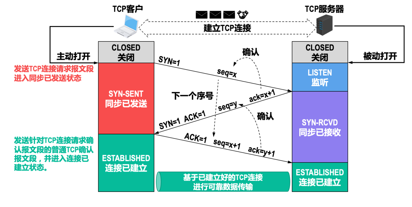 那么在建立连接场景中,服务器的应答可以稍微简单一些。当服务器收到客户端的SYN连接请求报文后,其中ACK报文表示对请求报文的应答,SYN报文用来表示服务器的连接也已经同步开启了,因为是在建立连接而不能通信,所以ACK报文和SYN报文之间,不会有其他报文需要发送,故而可以合二为一,可以直接发送一个SYN+ACK报文。所以,在建立连接时,我们只需要三次握手即可。