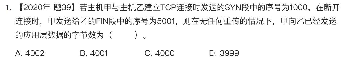 在三次握手中,我们最后一次握手的序号是多少?是这个1000吗?我其实想说的就是这个,我们第三个包的序号****其实是1001,因为第一个包的序号只是在给对方做提示罢了,目的就是为了让对方的确认号与我们的序号对上 ,**那么就说明,我们是从1001开始发的,那么挥手时的第一次连接也是一样的,我们的结束序号是在最后一个包的最后一个序号上+1的,那么我们最后数据包的最后那个序号其实是5000。**到这,答案也就出来了就是我们的C。