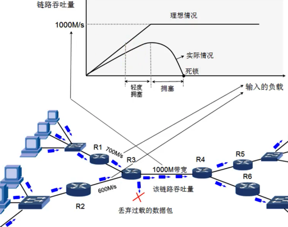 [● 拥塞:在某段时间,若对网络中某一资源的需求超过了该资源所能提供的可用部分,网络性能就要变坏,这种情况就叫作拥塞(congestion)。](#● 拥塞:在某段时间,若对网络中某一资源的需求超过了该资源所能提供的可用部分,网络性能就要变坏,这种情况就叫作拥塞(congestion)。)