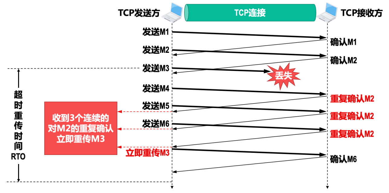 可以看到,图中我们M3丢失,我们M4,5,6到了之后连续确认了三次我们的M2,这样我们发送端一看三次确认就知道M3丢了,那么我们发送端就会直接进行重传。(而如果是个别非拥塞原因丢的包,我们的机制是不会降低cwnd的)。