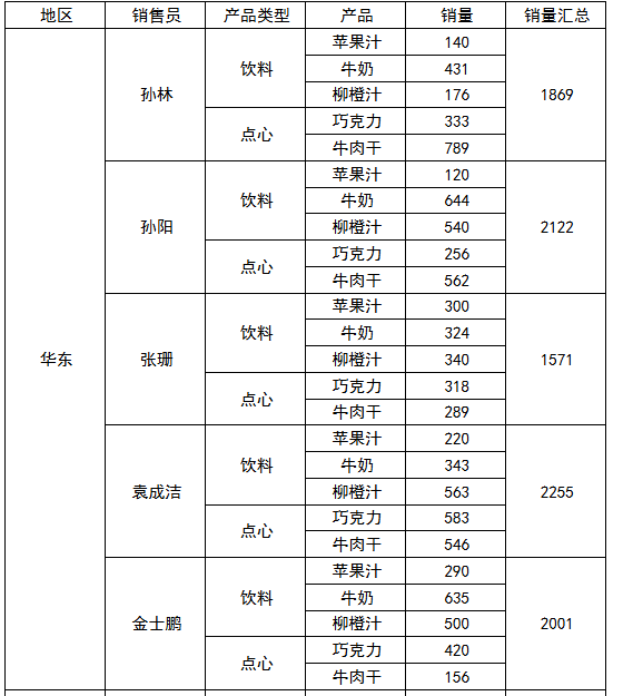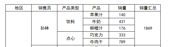 将销售员 孙林 的各个类型产品的销量做汇总,合并单元格后居中展示。
