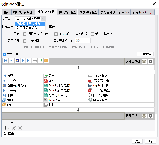 3.在上方 模板>模板web属性打开,根据实际需求,选择分页或者数据分析打开报表,选择 为该模板单独设置 ,然后在最下方的 事件设置 中选择 加载结束