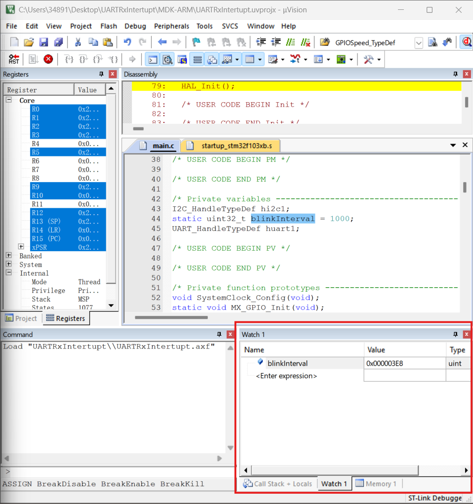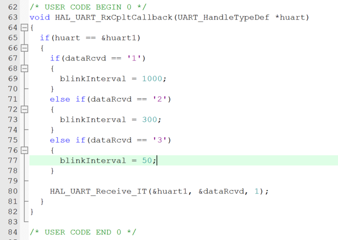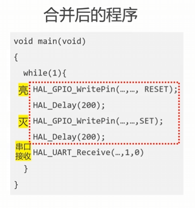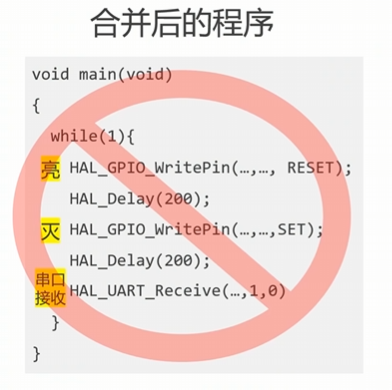 串口什么时候收到的数据,我们事先是不知道的,它是完全随机的,可能发生在程序执行的任何阶段,我们先假设串口接收数据是发生在闪灯的过程中: