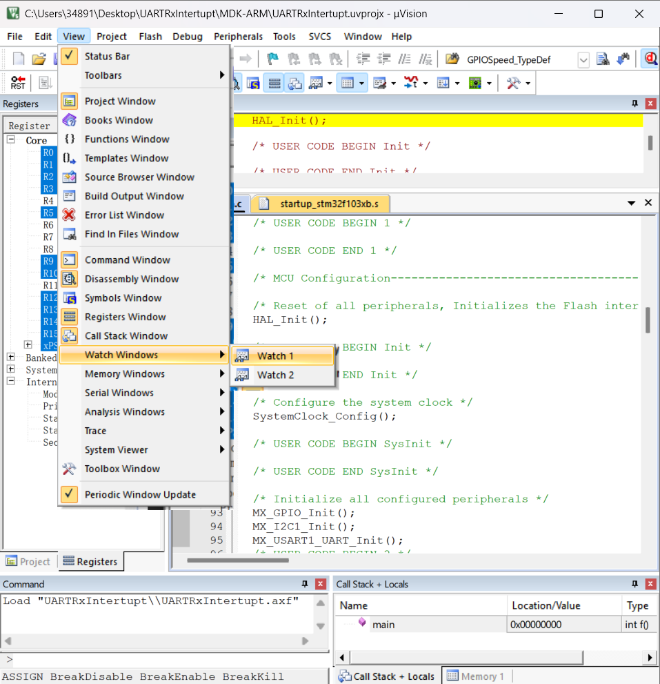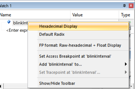 右下角出现监视窗口Watch1,Name中填上要监视的变量,并取消勾选Hexad...,Value将会以十进制呈现: