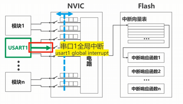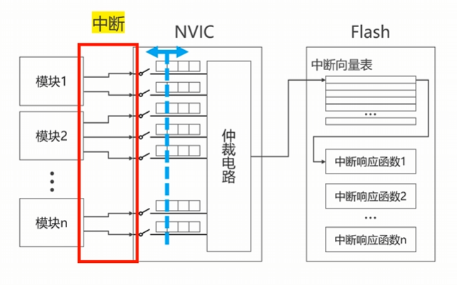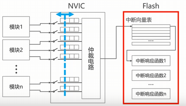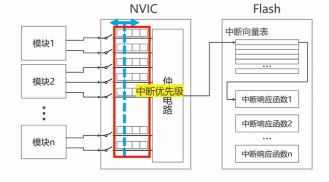 决定着发生嵌套还是排队,以及排队的先后顺序,如果一个中断响应函数胜出了,就需要在Flash中查表并调用它的中断响应函数来执行。