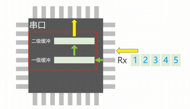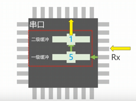 是不可以的。因为STM32的串口有两级缓冲,而每级缓冲只能保存一个字节,理想情况下,Rx引脚每接收一个字节,那个字节就直接通过一二级缓冲,就把它读出来,但若数据读取的没有那么及时,比如接收1、2、3、4、5五个字节时,1还卡在二级缓冲,后面的数据不断冲进来,它们就只能先存在于一级缓冲,于是2、3、4、5这些不断在一级缓冲将上一个字节给覆盖,最终缓冲区内就只剩下了1和5两个数字: