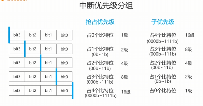 中断2的响应优先级是8,8的二进制是1000,它代表抢占优先级是1,子优先级是0,