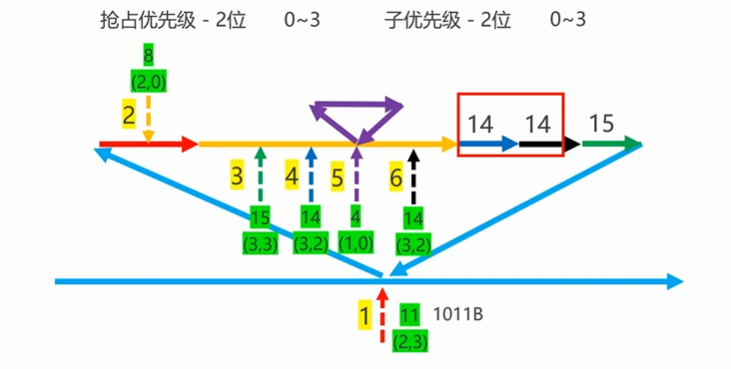 假设我们采用两位抢占优先级和两位子优先级的分组方式,其中,
