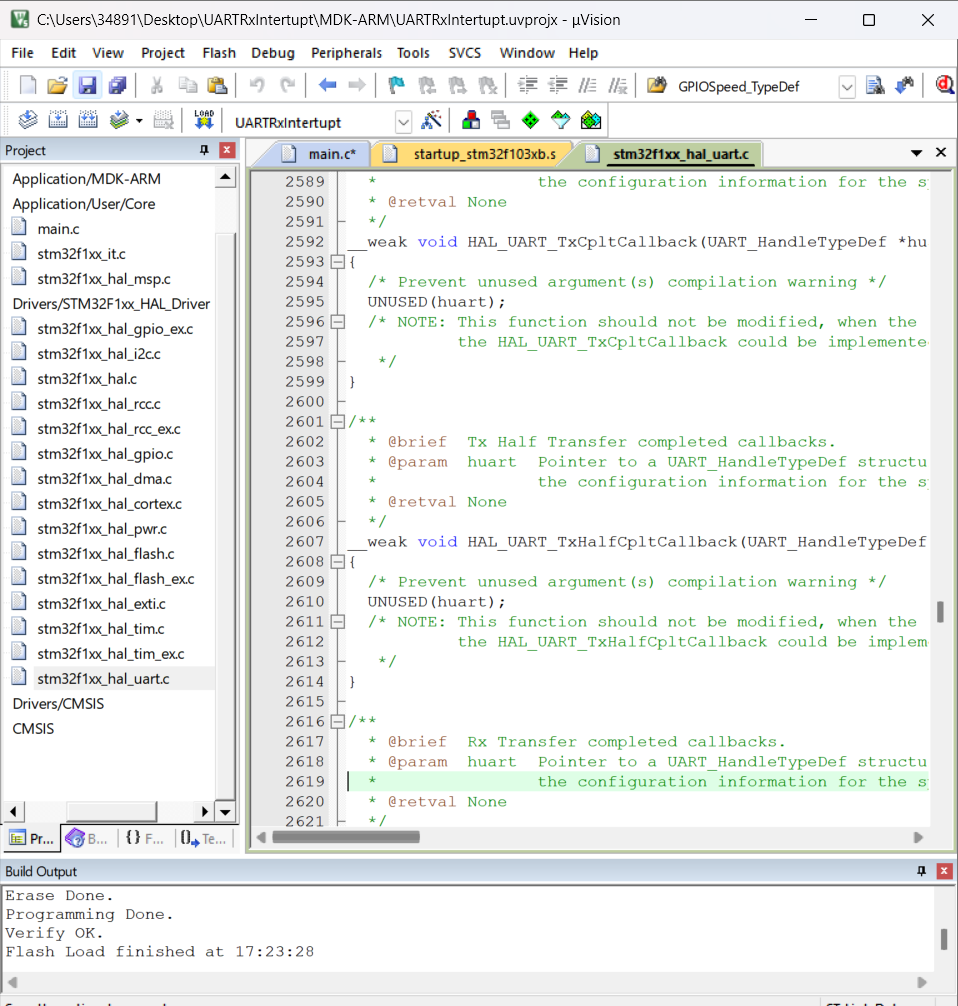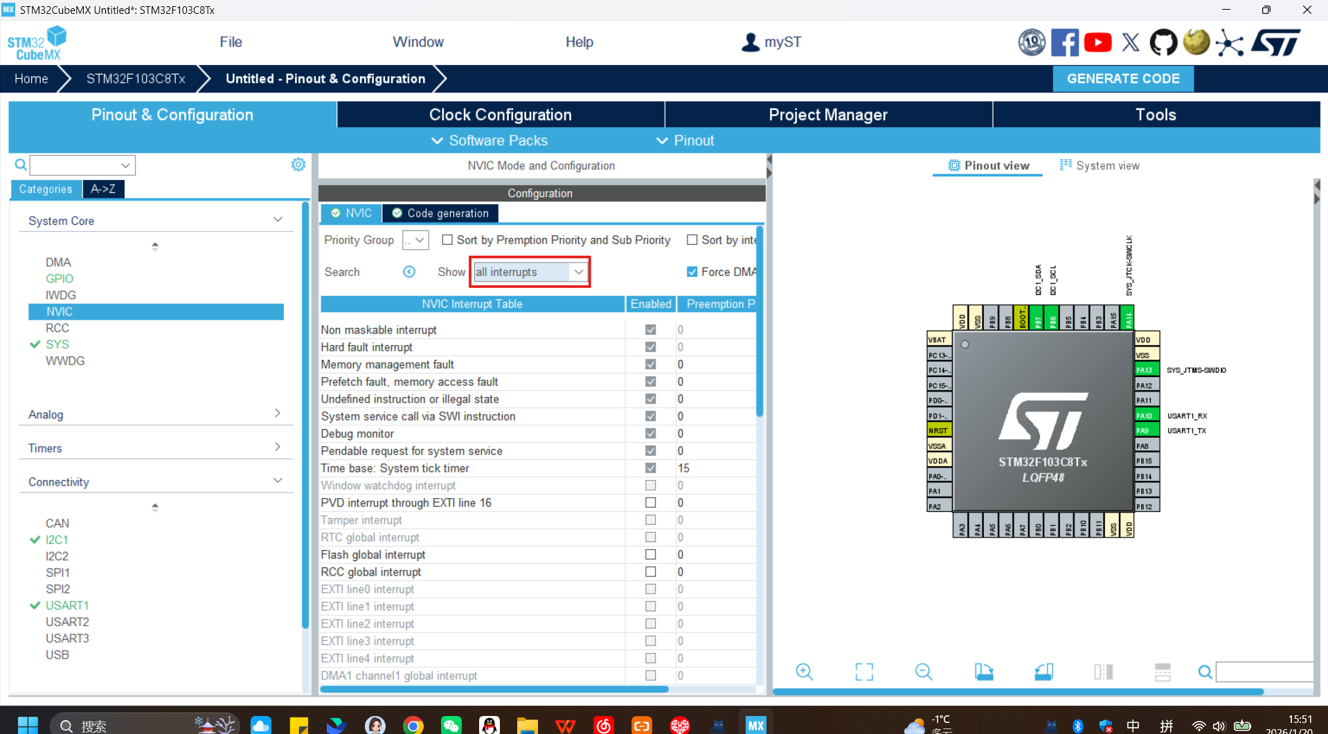 打勾,使能这个中断,再次生成代码,我们来进行一下中断的使用。