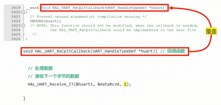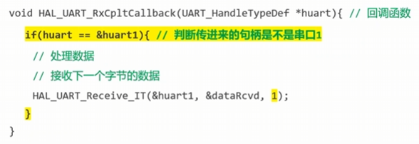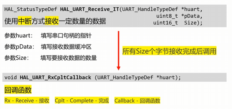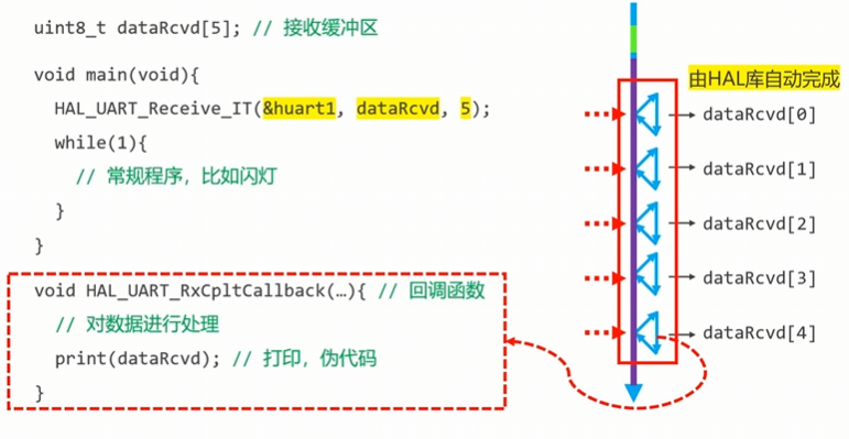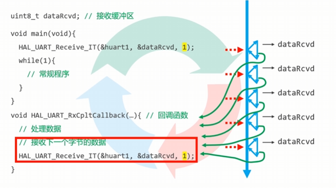 用中断方式接收数据,while执行常规程序,每接收一次数据,进行一次中断,并把数据保存在数据缓冲区内,接收到最后一个数据后调用回调函数,对数据进行处理:
