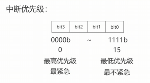 对于我们使用的单片机来说,它用四bit位的二进制数来表示中断优先级,紧急性从按序号的增长由高到低,共分为16个中断优先级: