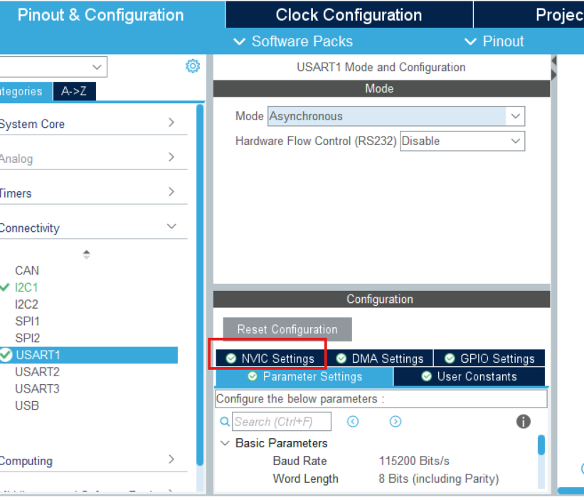 在I2C、SPI、USART模块都可以看到有NVIC Settings: