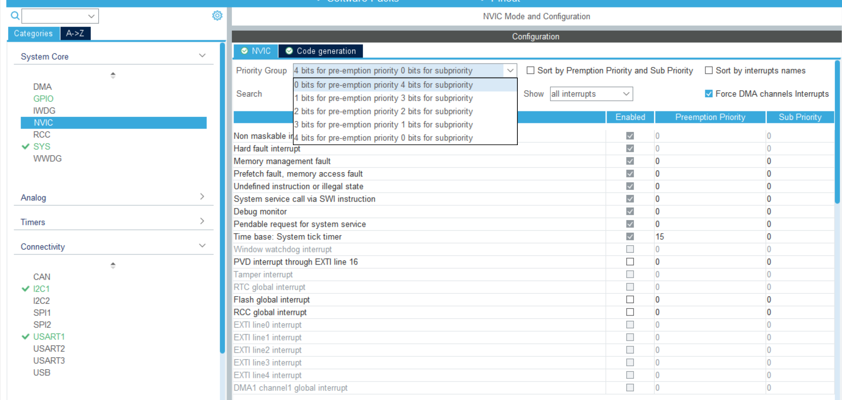 上面我们学习到的能够手动优先级分组,对应到CubeMX中的操作,就是下面这些选项: