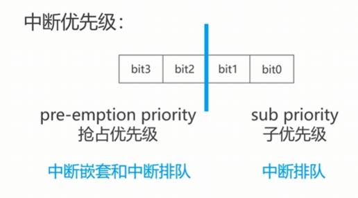 中断1的响应优先级是11,11的二进制是1011B,它代表抢占优先级是2,子优先级是3;