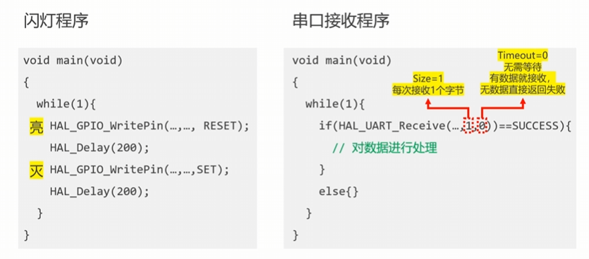 由代码可知,闪灯程序的执行时间是400ms,而串口接收5个字节只需要: