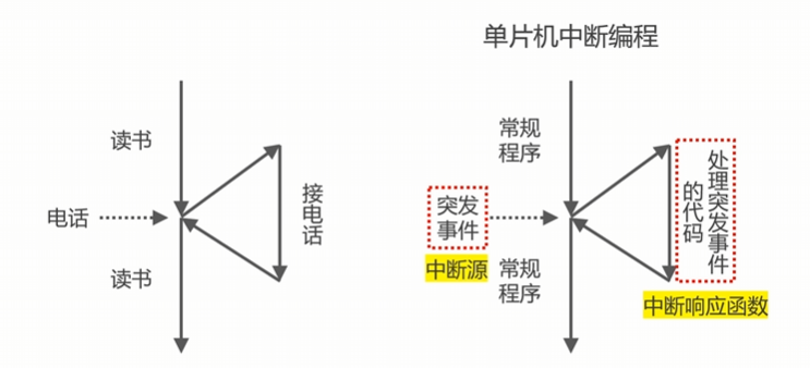 中断就是在做一件事情时,出现了一个优先级更高的突发事件,从而我们要停止手头的工作,需要先把那件更紧急的工作做完,再回过头来做最开始的事情: