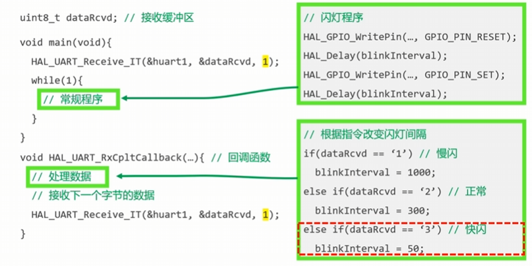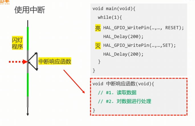 但我们可以使用中断的方法,它的逻辑是"不等你程序做完,我直接喊你处理数据",如果在闪灯的过程中,哪怕闪灯刚到一半,串口只要接收到1个字节,立刻触发"中断信号",此时闪灯程序会立即停止,立刻执行"中断响应函数",去取串口数据,并将缓冲区里的字节放到一边,中断程序执行完成后,再去取回之前取出的数据,继续之前的步骤 :