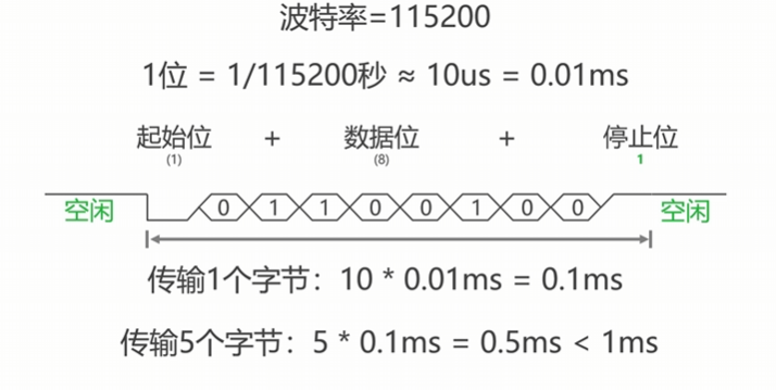 由此可知,当串口的波特率是115200时,串口接收5个字节只需要0.5ms(即5个字节全部进入缓冲的时间) ,但闪灯程序的执行至少需要400ms。若在闪灯程序执行过程中接收到5个字节,单片机此时需要执行完闪灯程序后才能执行读取字节的命令。但是闪灯程序长达400ms,缓冲中的字节不能及时读取,就会被后来接收到的字节覆盖,导致数据丢失。