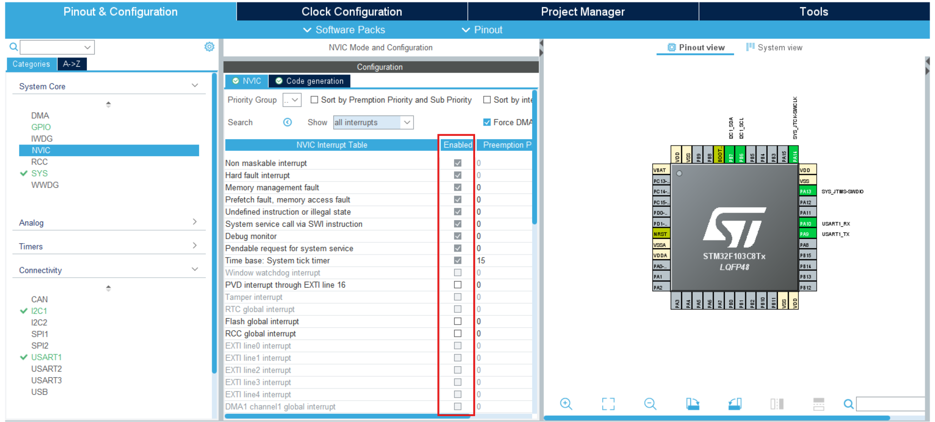 这么多中断需要一个管理员才能更高效的管理,而NVIC就是中断的管理员,下图的复选框和图中的开关一一对应,断开开关就是即使中断发生了,我们也不去响应它,由此来控制中断是否发生: