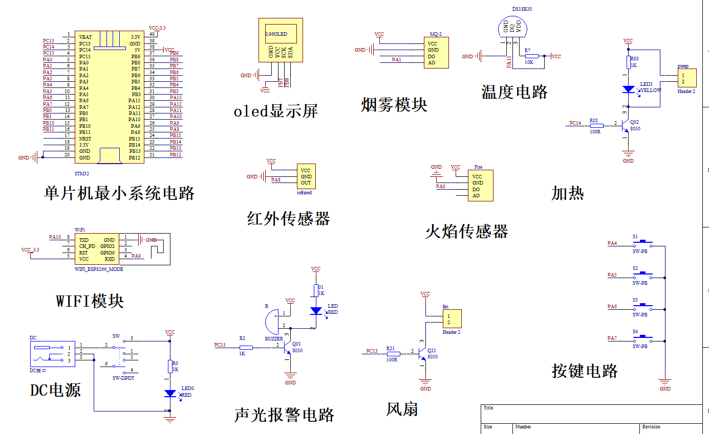 本设计由STM32F103C8T6单片机+WIFI模块ESP8266-01S电路+OLED屏幕电路+DS18B20温度传感器电路+MQ-2烟雾传感器电路+火焰传感器感器电路+红外光电传感器电路+风扇电路+蜂鸣器电路+按键电路+电源电路。