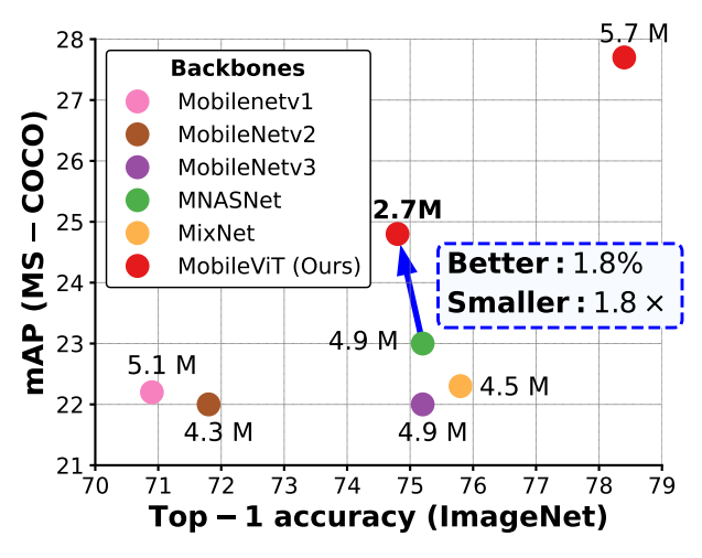 图1:与轻量级卷积神经网络模型相比,MobileVIT 在任务级泛化性能方面表现更优。表中列出了在 MS-COCO 数据集上使用不同特征提取器(MobileNetv1(Howard 等人,2017 年)、MobileNetv2(Sandler 等人,2018 年)、MobileNetv3(Howard 等人,2019 年)、MNASNet(Tan 等人,2019 年)、MixNet(Tan 和 Le,2019b)以及 MobileViT(我们的模型))的 SSDLite 网络的网络参数。