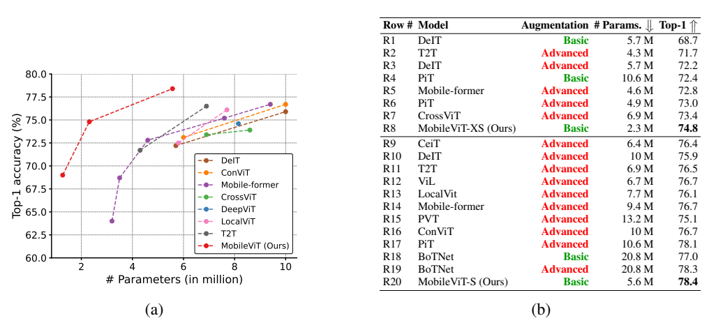 在 ImageNet-1k 数据集上,MobileViT 以更少参数实现更高准确率: