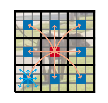 图3:在 MobileViT 块中,每个像素都能看到其他每个像素。在此示例中,红色像素利用转换器关注蓝色像素(即其他图像块中对应位置的像素)。由于蓝色像素已经通过卷积操作编码了关于相邻像素的信息,因此这使得红色像素能够对图像中的所有像素进行编码。在这里,黑色和灰色网格中的每个单元分别代表一个图像块和一个像素。