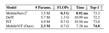 与 ViT 变体对比(5.6M 参数量):MobileViT-S 准确率 78.4%,比 DeIT(72.2%)高 6.2%,比PiT(73.0%)高 5.4%;