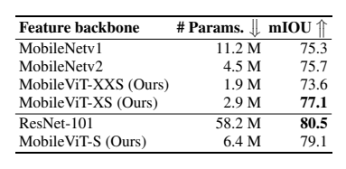 (1)DeepLabv3+MobileViT-XS(2.9M 参)mIOU 达 77.1%,比 MobileNetv2 骨干(4.5M 参,75.7%)高 1.4%;