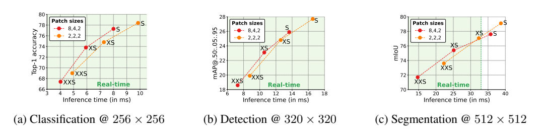 在 iPhone 12 上的实测结果显示,其中,绿色区域内的点表示这些模型能够实时运行,MobileViT 完全满足移动端实时性要求( latency <33ms):