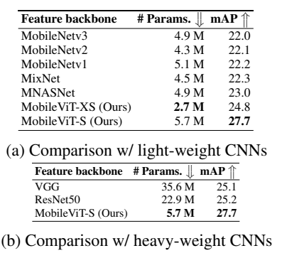 (2)MobileViT-S(5.7M 参)mAP 达 27.7%,超过 VGG16(35.6M 参,25.1%)和 ResNet50(22.9M 参,25.2%)。