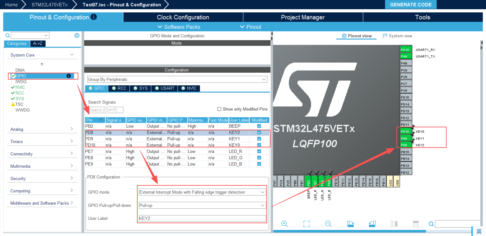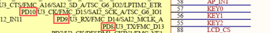 根据原理图, 设置PD8, PD9, PD10为EXTI外部中断线