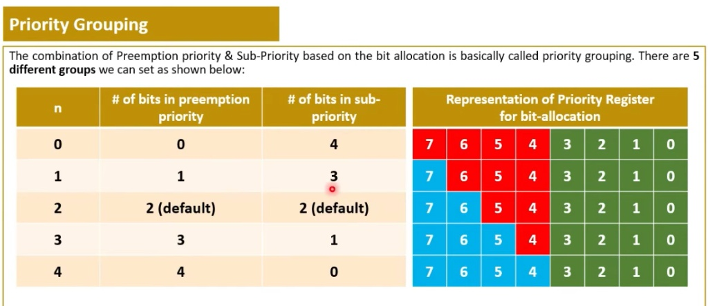 Grouping of priority values into group priority and subpriority fields : 优先级数值划分为抢占优先级和响应优先级两个字段