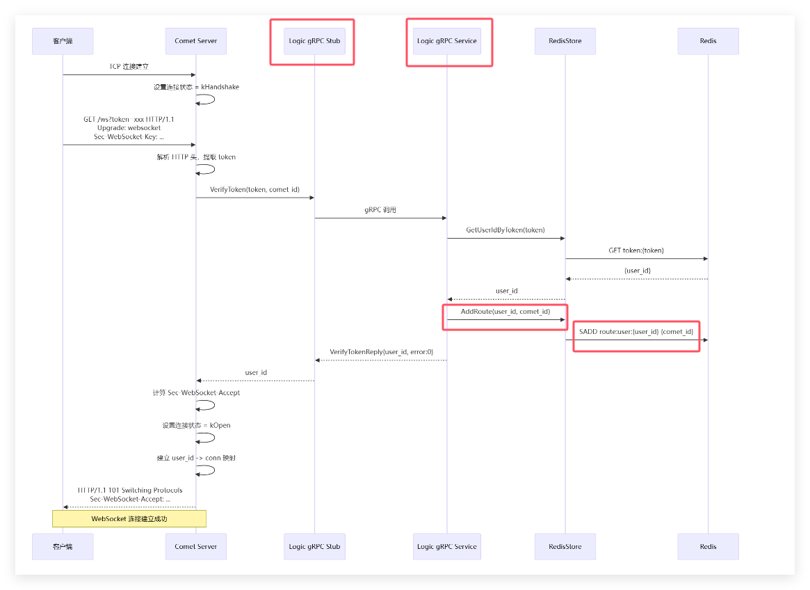 comet模块的tcpserver服务器监听到用户消息,触发OnMessage回调,第一次调用这个回调,需要先进行Websocket握手把HTTP服务升级。正常的获取字段回复字段就不赘述了,这里补充项目中的特点:1.会在鉴权把token发给logic检查的时候,顺便也把comet_id发过去了,这样要是logic那边返回鉴权ok,logic也能在redis里顺便存下user_id与comet_id的映射。一举两得。2.可能是之前遗漏的一点,就是muduo的Tcpserver服务器还有提供一个上下文字段,而且还有对应的set方法,目的就是提供给开发人员,看看你有没有什么东西要绑定到这个TcpConnection上面的。而我们这里的鉴权成功后,刚好需要把user_id绑定上去,因为后面是websocket长连接,一次鉴权成功后,后续这个连接就和这个user_id绑定了,会高效很多。