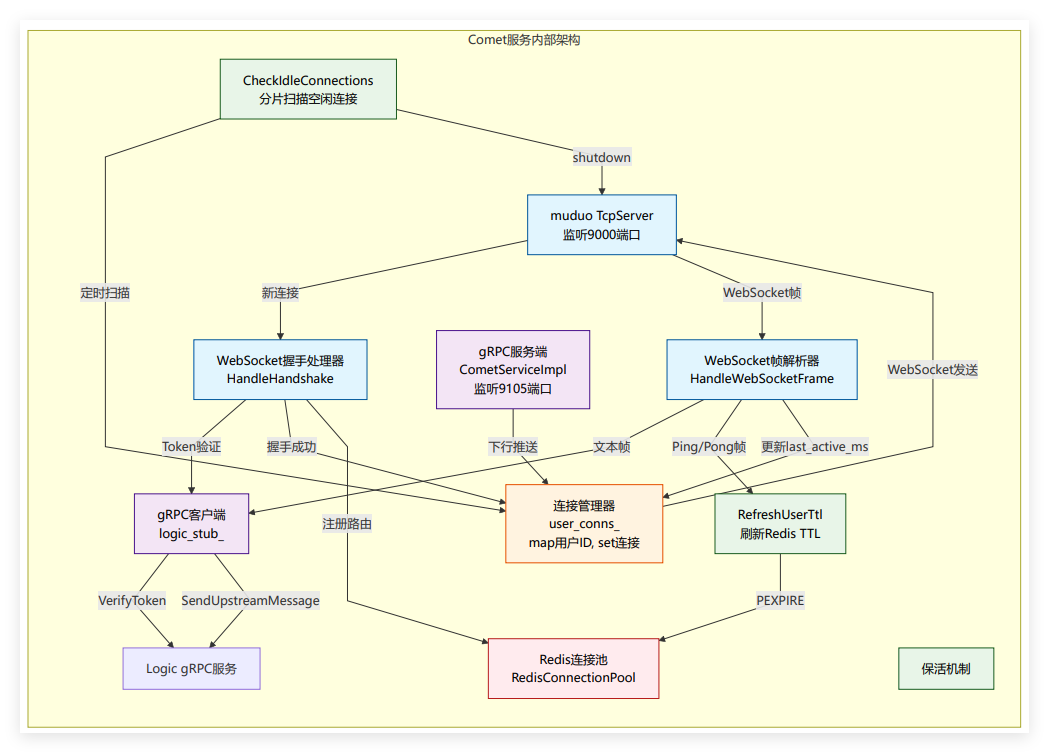 在websocket连接建立后,客户端和服务器互相发"心跳"以表明连接存活,每固定时间发送业务心跳(特定 JSON 消息)。comet的tcpserver服务器,就需要连接redis,然后在接收到这种心跳帧就把user_id为key的键值对的TTL进行刷新,默认就是60s,在有任何业务处理也会刷新TTL。如果超时了,其实也就类似用户退出了,就需要清理两个地方:1、redis的路由,2、cometserver服务器栈上保存的user_id到Tcpcon的映射。
