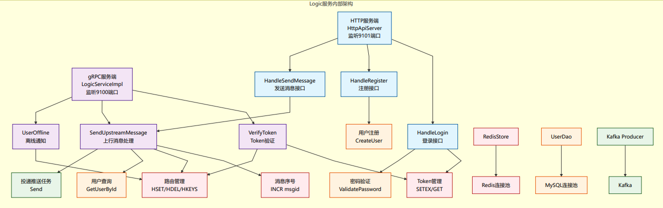 logic:鉴权/token;消息持久化(MySQL)、路由/房间缓存(Redis);计算 fanout→ Kafka。