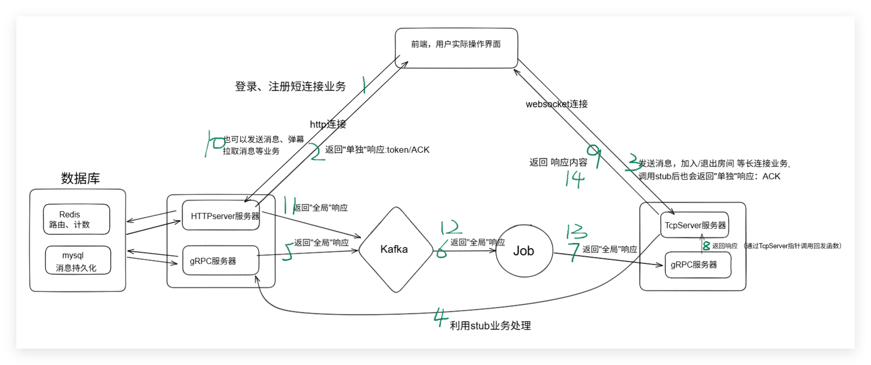 用户1连接到comet1服务器,发送消息给用户2(用户2可能连接 到了comet2和comet3服务器,因为支持多条连接,可能开启了多个网页访问),消息通过grpc服务提交给logic业务处理,logic会把消息存储到MySQL和Redis(存储房间相关信息),再把消息发送到kafka,job模块负责从Kafka取出消息,选择一个comet进行发送(job会连接到所有的comet)。用户2在websocket登录的时候,就要在redis里面存储用户id 连接uuid cometid 对应的映射,这样在job选择发送的时候有所依据避免广播所有的comet。