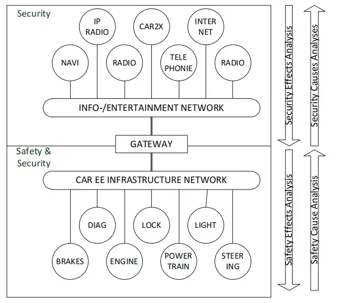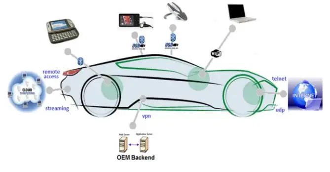 配备现代信息娱乐和远程信息处理系统的汽车拥有多种无线、软件控制接口,如全球移动通信系统(GSM)、通用移动通信系统(UMTS)、长期演进技术(LTE)、蓝牙(Bluetooth)或无线网络(WiFi)。此外,远程信息处理功能将无线连接与关键车辆功能(如灯光、发动机、制动或转向控制)相结合,以实现远程维护或紧急呼叫等功能。