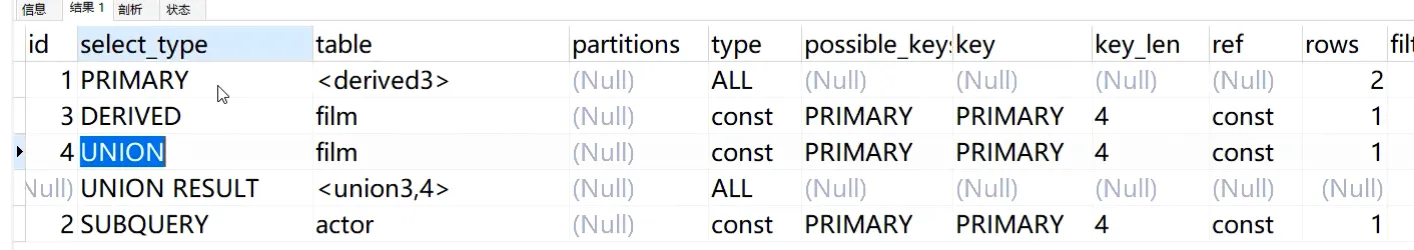 - union result:从 union 去重临时表检索结果的 select,union all 不会出现union result