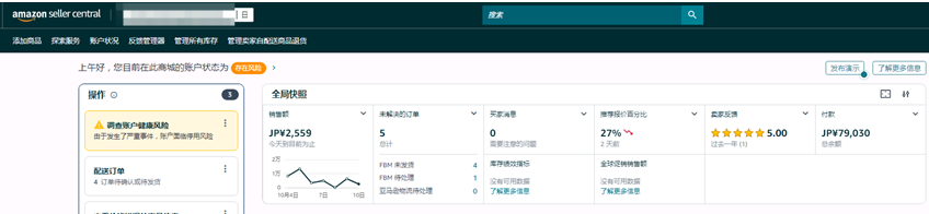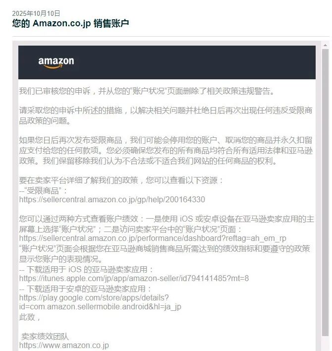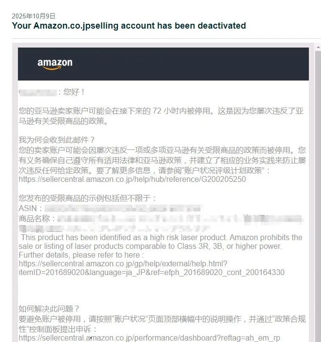 2025年10月9日,该卖家收到亚马逊业绩通知,通知指出,因账户屡次违反受限商品政策,亚马逊将在72小时内停用该卖家账户。
