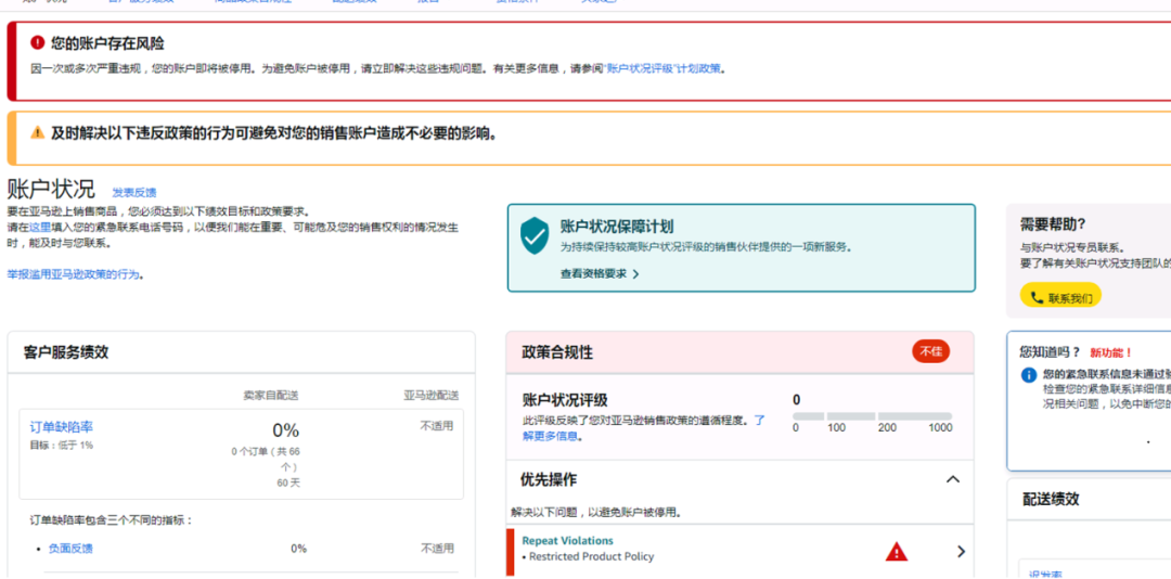 接到订单后,SellerAegis/卖家守护立即启动账户状况专项核查工作。核查结果显示,该账户当前评级分数为0分,已处于即将被封禁的高危状态;账户因屡次违反受限商品政策被平台标记,该违规记录对账户评分造成严重负面影响,由此可以判定此次账户预警的核心原因即为违反受限商品政策。