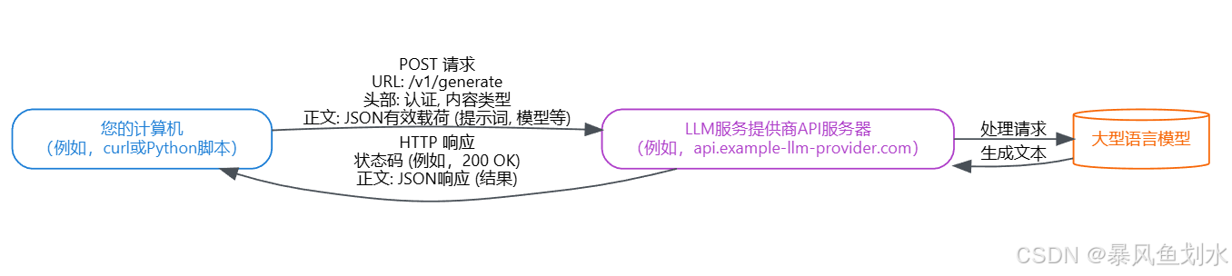 客户端向API服务器发送一个HTTP POST请求,其中包含必要的信息(URL、头部、正文),服务器验证请求,将指令传递给实际的LLM,接收生成的文本,并通过HTTP响应将其发送回客户端。
